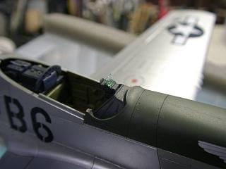 | キャノピー内の円弧状フレームですが、キットのものは穴の数が違うのでUltracastのレジンパーツに換えました。本当はこのフレームはキャノピー側に固定されているのですが、ずるをして胴体側のラジオボックスに固定してしまいました。閉状態のキャノピーと胴体の間に段差ができてしまっていますが、未修正です。マーキングはスーパースケールデカールを使いましたが、実機写真を見るとコートレターの"6"は下の部分にだけスリットが入っているので、そのように修正しました。 | |
