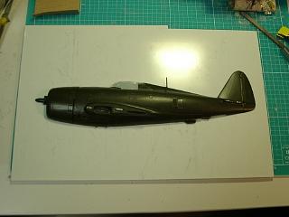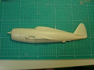 XP-47Jを作ったときに、モノグラムキットの胴体パーツ他が余りました。味のあるモールドで、捨ててしまうのはもったいないので半身のレリーフとして活用することにします。デカールも大量に余っていることだし、この際、レジンで複製することにしました。キャノピーとスピナーをまっぷたつに切って、左半分のパーツ一式をプラ板の上に並べて仮止めします。シリコンゴムが入りこむと困るような、カウリングその他の開口部は、プラ板やパテでふさいでおきました。