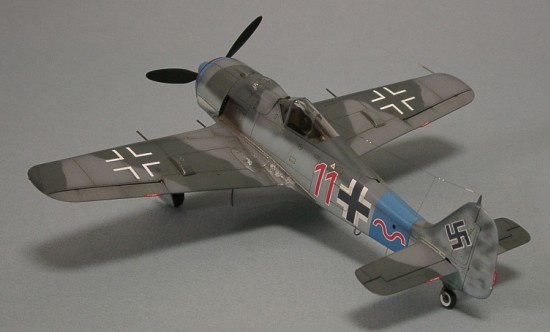 田宮の1/48 Fw190F-8キットをベースに、Cutting Edgeのレジン製コンヴァージョンセットより、外翼機銃パネルと銃身基部のフェアリングを追加してA-8に改造。ガンカメラと尾灯を透明化、ピトー管はファインモールドの挽きもの、機銃身も金属パイプに交換。コックピットはシートをUltracastのものに交換しただけ。デカールはCutting Edgeより。防弾リングは黒の指定だが、赤だった可能性もあると書いてあったので一瞬迷った後に採用したが、おもちゃっぽくなったかも?